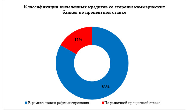 Основная доля кредитов была выделена на льготной основе в рамках ставки финансирования — 83,2% или 6,6 трлн сумов. Доля кредитов, выделенных по рыночным ставкам, составила 16,8% ил 1,3 трлн сумов: