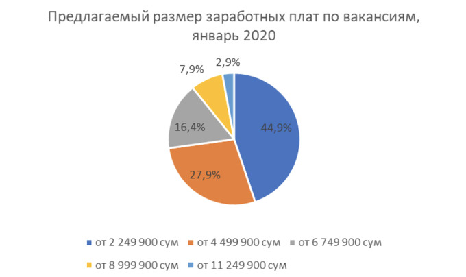 Наиболее популярный размер заработных плат, который предлагают работодатели с начала этого года, составляет от 2 249 900 сумов. Об этом говорится в исследовании hh.uz (есть у Spot).
