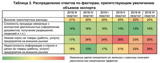 Стабильно увеличивается число предприятий, которые не могут увеличить экспорт из-за недоступности информации о спросе и ценах на внешних рынках — если в конце 2018 года таких было 13%, то в конце 2019 году уже 26%. Еще одна проблема — низкий спрос на внешних рынках (25%).