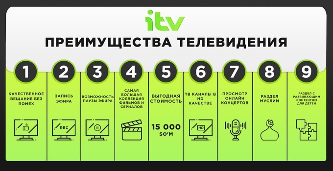 Компания ITV предлагает перейти на цифровое телевидение и платить всего лишь 15 000 сумов в месяц.