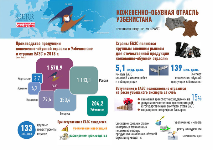 Вступление в ЕАЭС может способствовать увеличению экспорта, в частности, ожидается повышение экспортных возможностей кожевенно-обувной отрасли Узбекистана в 2 раза.