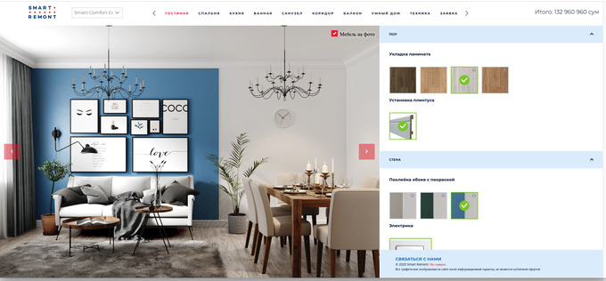 Smart Remont — программа, которая позволяет в несколько кликов сделать дизайн квартиры. На сайте компании или через приложение нужно выбрать из списка свой город, жилой комплекс и планировку квартиры. Система предложит три варианта дизайна: в неоклассическом, скандинавском стиле и лофт. На экране отображается точная стоимость ремонта, компания дает гарантию на работы 1 год.
