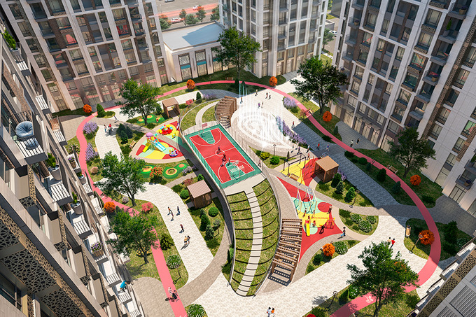 Во дворе комплекса будут детские игровые площадки, много зелени и деревьев, отдельная дорожка для мам с колясками. Для их удобства во дворе появятся пеленальные комнаты. Для активных жильцов предусмотрены воркаут-площадки.