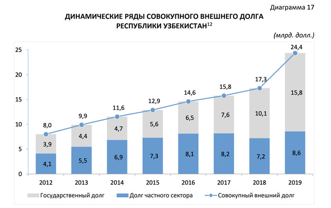 Совокупный внешний долг Узбекистана по итогам 2019 года составил $24,4 млрд следует из данных Центрального банка.