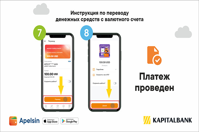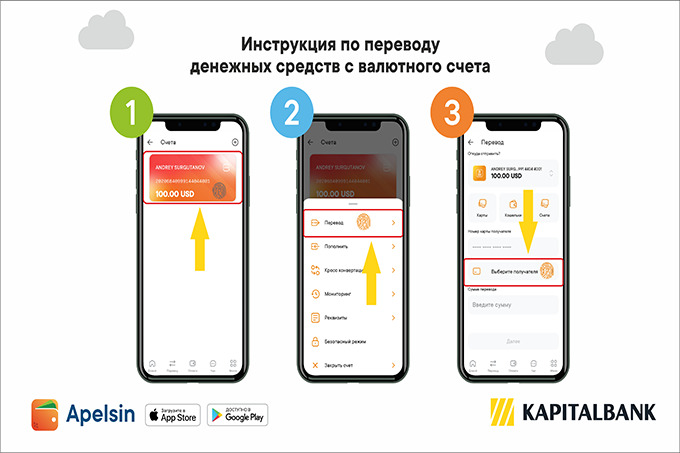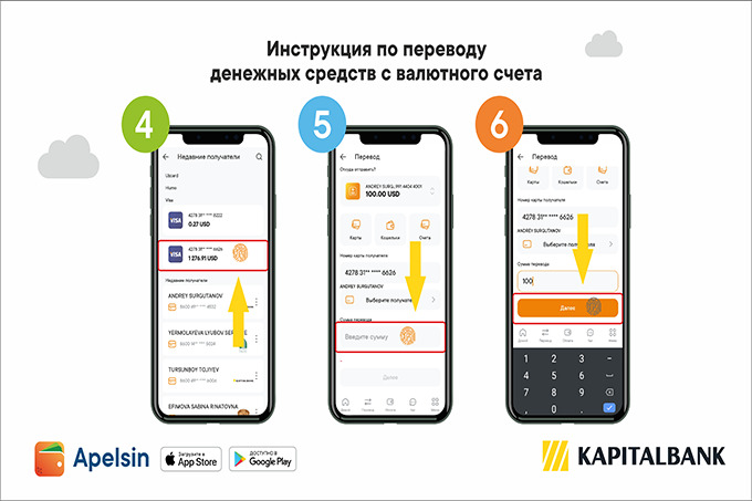 Деньги со счета можно перевести на карту VISA «Капиталбанка» или на карты Uzcard и Humo при условии, что карты добавлены в Apelsin.