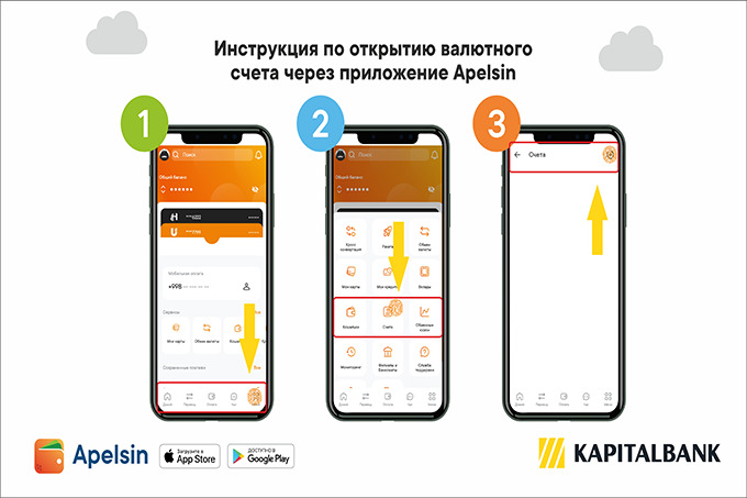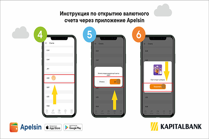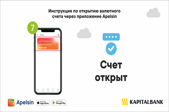 Если у клиента есть на руках карта VISA «Капиталбанка», то можно добавить ее в Apelsin и счет откроется автоматически. Во вкладке «Счета» всегда можно найти свой валютный счет и проверить его состояние.