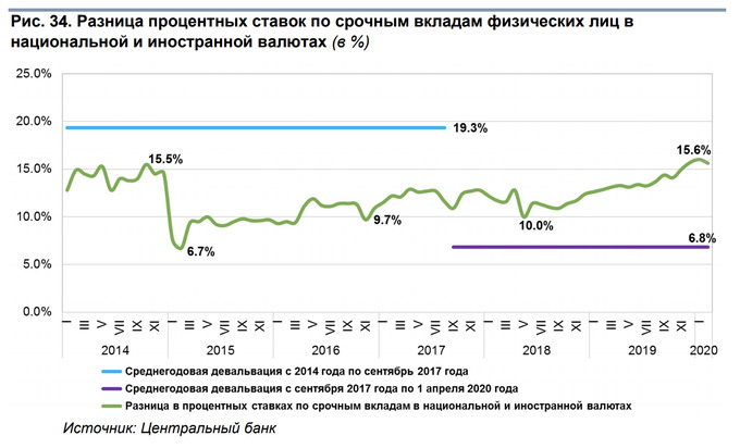- среднегодовая девальвация в период с 2014 года по сентябрь 2017 года составляла 19,3%, что больше разницы между двумя типами депозитных ставок, и, следовательно, хранение сбережений в иностранной валюте было выгодным
