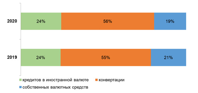 В структуре источников финансирования импорта, доля конвертируемых средств на внутреннем валютном рынке, составила 56%, доля финансирования импорта за счет собственных средств в иностранной валюте составила 19%.