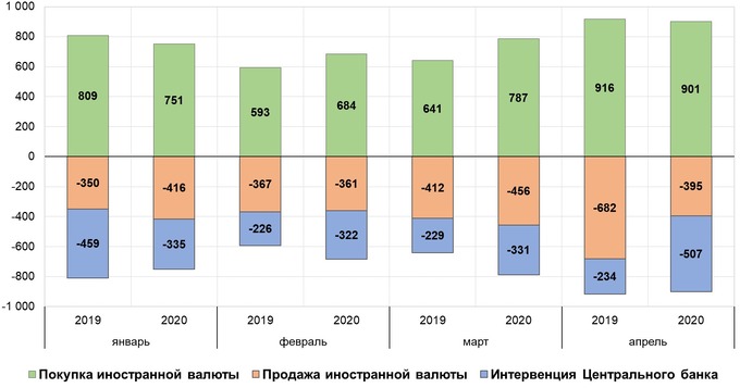 Совокупный объём предложения валюты на валютном рынке (без учёта интервенций Центрального банка) составил $2,7 млрд., сохранившись на уровне первых четырех месяцев 2019 года.