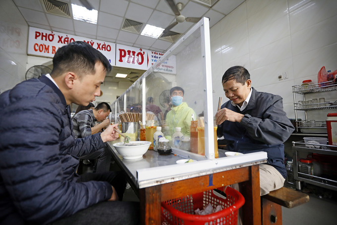 Рестораны используют в качестве одного из средств защиты пластиковые разделители. Такая прозрачная стена отделяет друг от друга посетителей ресторана во вьетнамском Ханое: