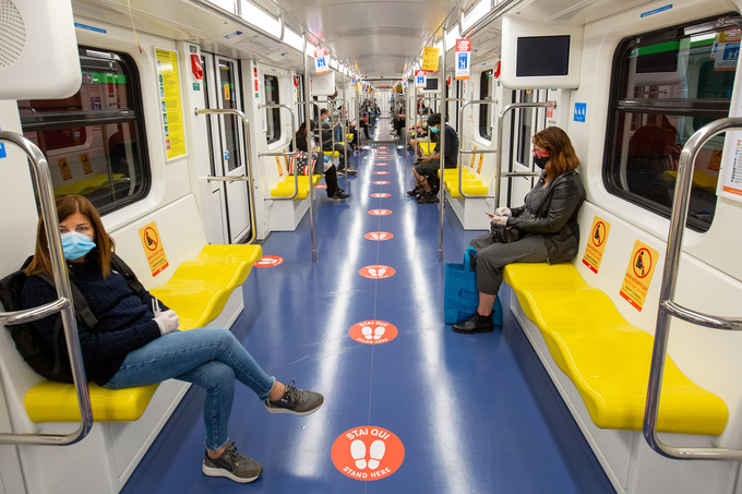 В общественном транспорте власти запрещают садиться на соседние места и используют разметку, чтобы показать, на каком расстоянии друг от друга должны стоять люди. Вот так это выглядит в Милане: