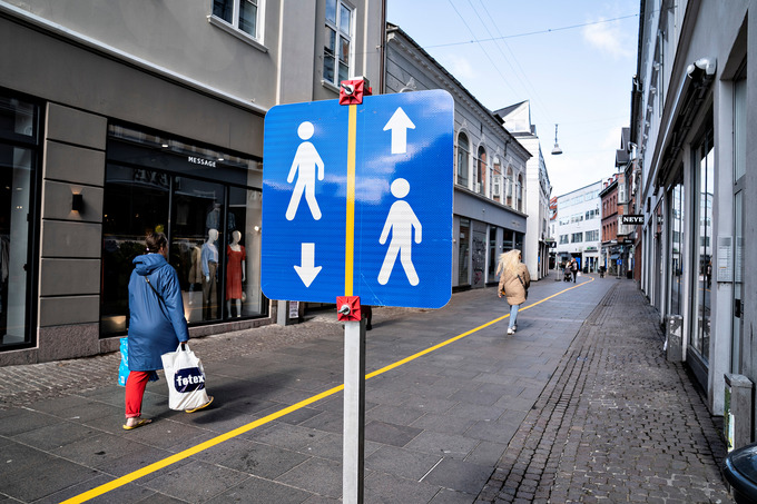 В датском городе Ольборг посреди пешеходной дороги нарисовали желтую разметку, которая должна помочь людям соблюдать дистанцию: