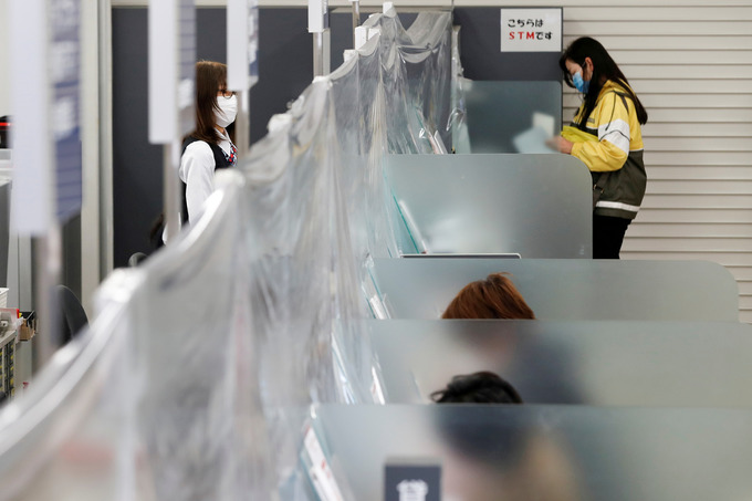 Сотрудники банка MUFG в Токио не только носят маски, но и общаются с клиентами через прозрачный экран: