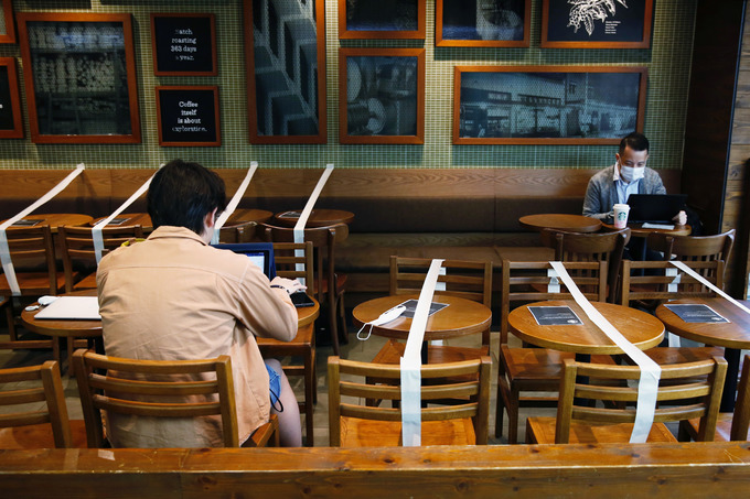 В одной из кофеен Starbucks в Гонконге часть столов и стульев обмотали изолентой, чтобы посетители не садились близко друг к другу: