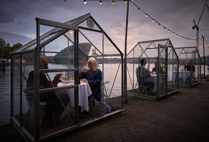 Ресторан Mediamatic ETEN в Амстердаме придумал свой способ соблюдения социального дистанцирования. Гостей посадят в «теплицы» — стеклянные кабинки, куда помещается до трёх человек. Официанты носят защитные экраны и подают блюда на длинных досках: