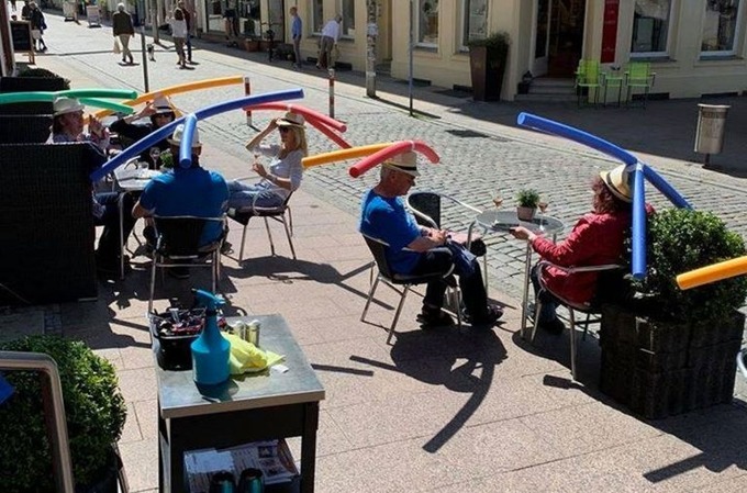 Открывшееся после карантина кафе Rothe не стало использовать разметку на полу или защитные экраны для лица для соблюдения социального дистанцирования. Вместо этого гостям раздают соломенные шляпы, на которых закреплены яркие палки для плавания: