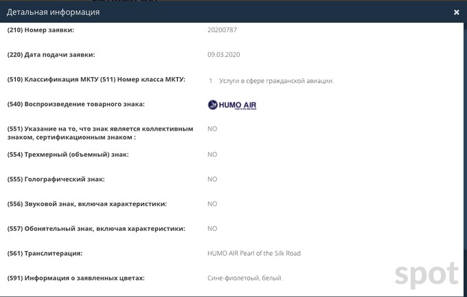 Заявку подало другое физическое лицо, но на этот раз в качестве класса указана услуга в сфере гражданской авиации. Помимо этого, товарный знак содержит дополнительные слова — HUMO AIR Pearl of the Silk Road: