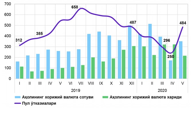 В итоге, в апреле сум обесценился на 5,8%, превысив планку в 10 000 сумов за 1 доллар США, однако в мае ситуация стабилизировалась, в том числе, из-за того, что денежные переводы существенно выросли, и население снова вернулось к продаже валюте.