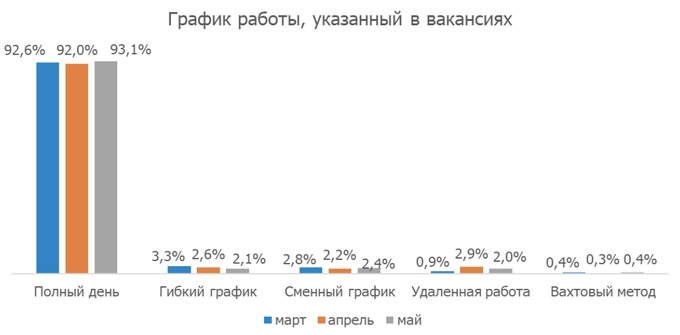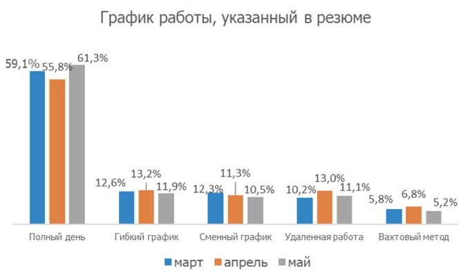 Что касается графика работы, указанных в резюме, то в период карантина среди соискателей вырос спрос на удаленную работу. Если в марте доля резюме с удаленным графиком работы составляла 10% от общего числа резюме, то в апреле эта цифра выросла до 13%.