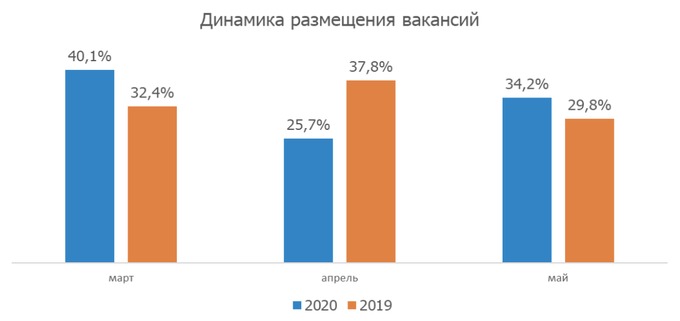 Сравнивая динамику размещения вакансий в марте-мае с аналогичным периодом 2019 года, можно увидеть, что основное снижение числа вакансий приходится на апрель 2020 года, тогда как в апреле 2019 года было размещено наибольшее количество размещенных вакансий: