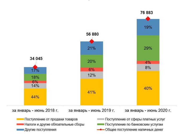 Значительная доля прироста денежных поступлений в июне приходится на сферу торговли и платных услуг — 3,5 трлн сумов, и банковских услуг — 1,4 трлн сумов. Объясняется это возобновлением деятельности торгово-сервисных объектов в «зеленых» и «желтых» зонах, смягчением запретов на движение автомобилей, а также ростом выплат по кредитам, вкладов и покупок иностранной валюты населением.