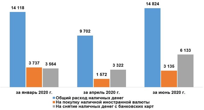 Расход наличных денежных средств в условиях карантина сохранился относительно стабильным в результате осуществления пенсионных выплат, пособий, заработных плат работникам организаций бюджетной системы и стратегических предприятий, не приостановивших свою деятельность.