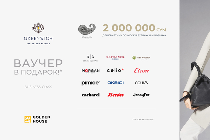 До конца этого месяца Golden House дарит ваучер номиналом 2 млн сумов, с помощью которого вы можете совершать покупки в партнерских бутиках и магазинах.