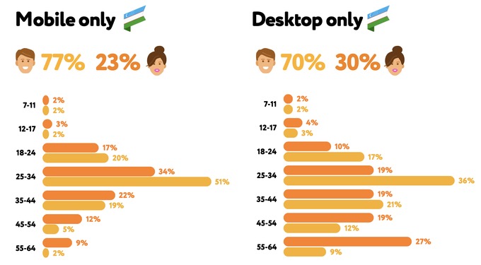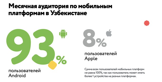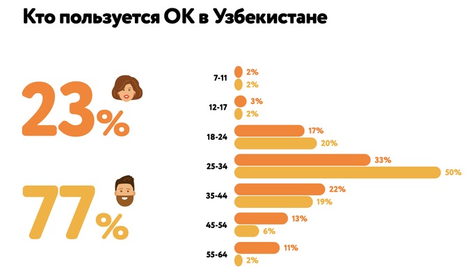Так, к примеру, стало известно, что ОК в Узбекистане пользуется 2,1 млн человек. Это в основном мужчины — 77%. Основной возраст — 25−34 года. Большинство заходят с мобильного телефона, причем ОС Android — на iOS приходится лишь 8%.