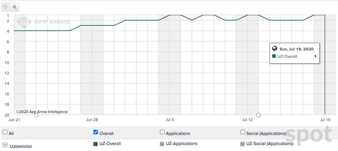 Осенью 2019 года Spot писал, что популярность TikTok добралась до Узбекистана — сервис тогда впервые вошел в топ-5 по количеству скачиваний. На середину июля TikTok — самое скачиваемое приложение в стране, причем как среди пользователей iOS, так и Android: