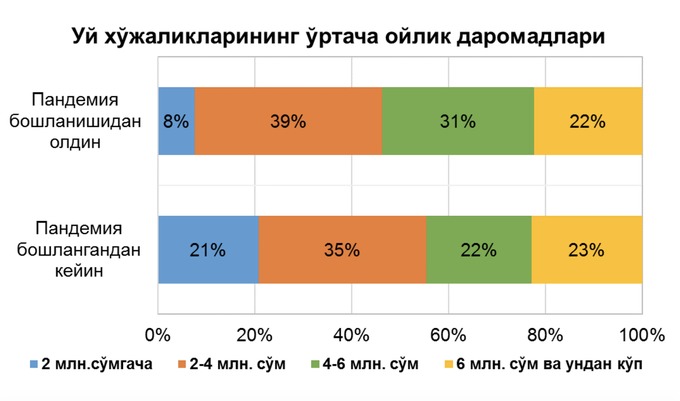 Так, почти в три раза выросло количество тех, чей доход составляет до 2 млн сумов. Количество домохозяйств с доходом от 2 до 4 млн сумов сократилось с 39% до 35%, с доходом от 4 до 6 млн сумов — с 31% до 22%.