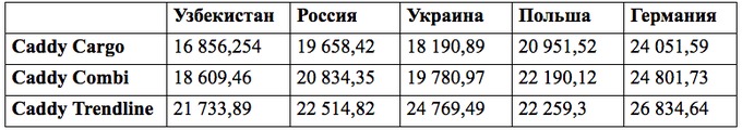 Чтобы было легче сравнить стоимость моделей Volkswagen Caddy в Узбекистане, ниже приведены цены с курсом доллара ЦБ от 4 августа 2020 года: