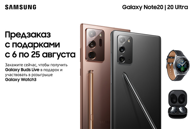 А для желающих стать первыми обладателями смартфонов Galaxy Note 20 открыт предзаказ до 25 августа. Покупателям по предзаказу Samsung приготовил подарок — беспроводные наушники Galaxy Buds Live. Более того, каждый сделавший предзаказ примет участие в розыгрыше пяти умных часов нового поколения Galaxy Watch 3.