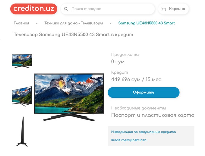 Например, можно купить новый телевизор Samsung с диагональю экрана 43 дюйма без предоплаты и смотреть его всей семьей, и при этом ежемесячно выплачивать по 445 тысяч сумов на протяжении 15 месяцев. Поэтому можно делать даже большие покупки и не бояться, что в семейном бюджете образуется дыра.