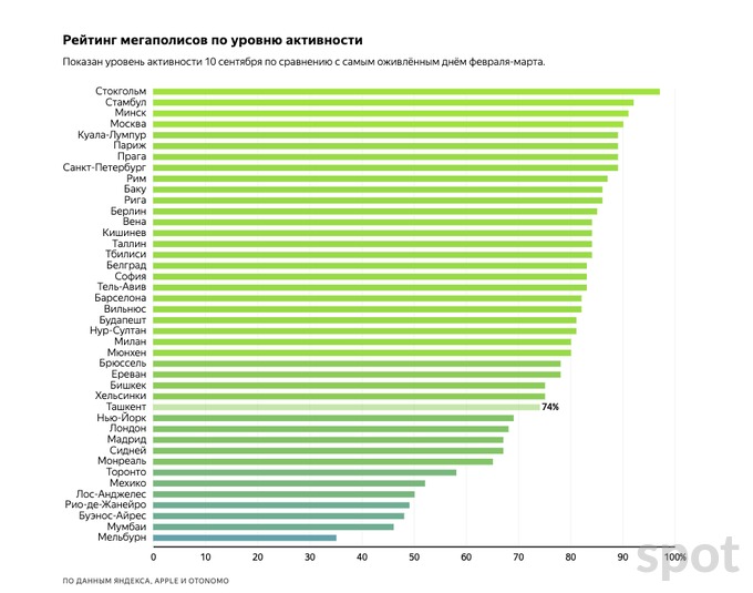 Из 42 изученных городов ближе всех к своему обычному состоянию 10 сентября были Стокгольм, Стамбул и Минск. Меньше всех на себя походили Мельбурн и Мумбаи:
