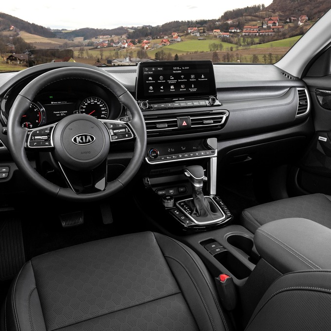 В салоне у Kia Seltos — 10,25-дюймовый сенсорный экран информационно-развлекательной системы, заключенный в отдельный блок, а также многофункциональное рулевое колесо. В списке опций: «умная» система подсветки, восьмидюймовый проекционный дисплей и аудиосистема Bose.