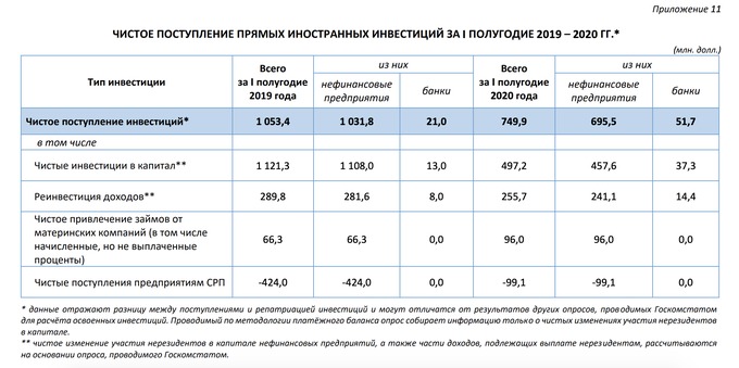 «На фоне кризисных явлений в глобальной экономике чистые иностранные инвестиции в капитал сократились в 2 раза, тогда как объёмы реинвестирования доходов иностранными инвесторами остались практически на уровне показателя I полугодия 2019 года», — обратили внимание в ЦБ.
