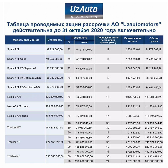 UzAuto Motors начала продавать бюджетные модели в рассрочку (до этого были только топовые). Это делается в рамках акции до 31 октября, уточнили в пресс-службе компании.