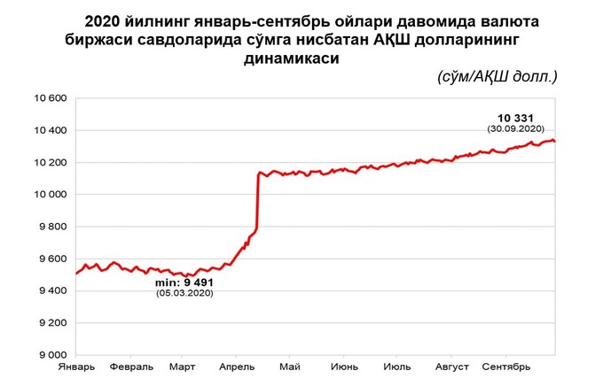 За первые девять месяцев сум по отношению к доллару обесценился на 8,6%. В ЦБ считают, что существуют достаточные условия для поддержания баланса спроса и предложения иностранной валюты на внутреннем валютном рынке до конца года.