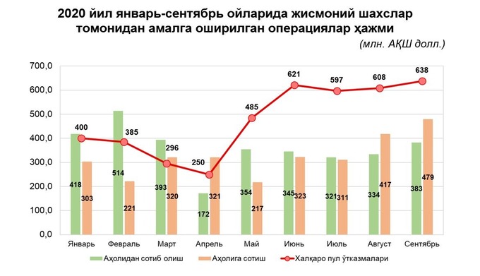 Объем притока иностранной валюты в страну посредством международных денежных переводов составил $4,3 млрд. В сентябре эта цифра составила $638 млн, что на 8% больше, чем за аналогичный период прошлого года: