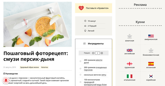 Так, для торговой марки Evian был подготовлен пошаговый рецепт смузи с персиком и дыней. А для компании Danone была внедрена продукция «Растишка» в статью с идеей для ланчбокса.