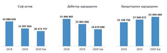 Чистые активы сократились почти в два раза — с 43 млрд сумов в 2018 году до 26,4 в 2020 году. Долги компании выросли до 63,9 млрд сумов, тогда как другие ей должны 19,6 млрд сумов (первый показатель все три года растет, второй — снижается):