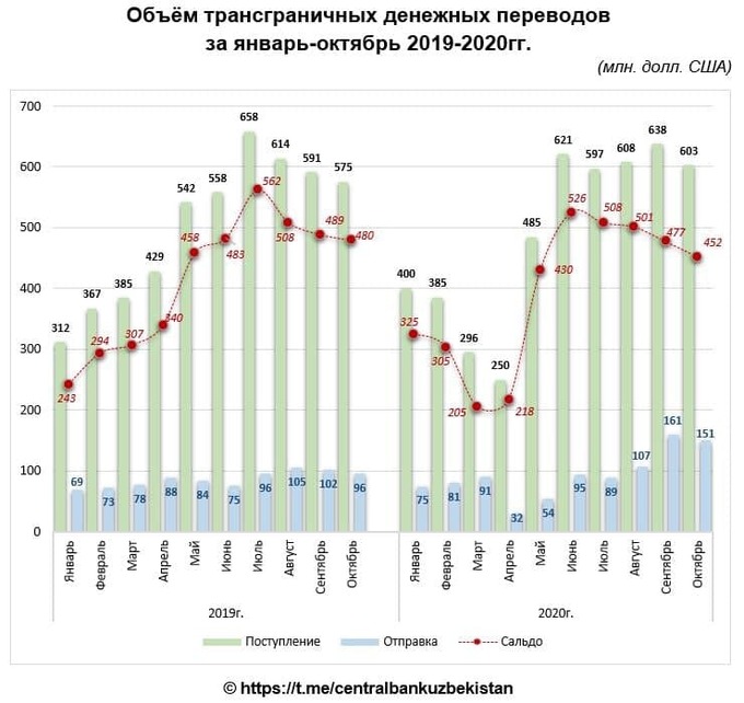 Месяц назад Spot писал, что денежные переводы в Узбекистан не только восстановились до показателей 2019 года, но и превысили их в отдельно взятом месяце. Так, к примеру, в сентябре в страну прислали более $600 млн, тогда как в том же месяце прошлого года было в районе $590 млн.