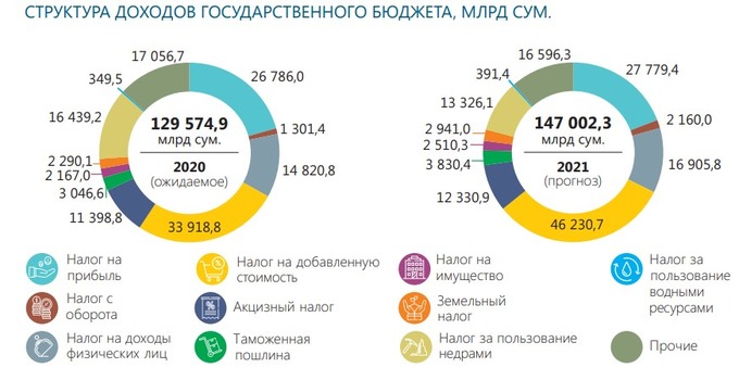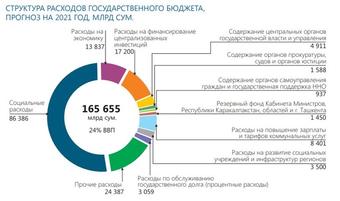 В 2021 году 40% социальных расходов составят расходы на образование. На здравоохранение планируется выделить 19,6 трлн сумов. Более 60% этих средств будет направлено на заработную плату медицинским работникам. В связи с пандемией в бюджет заложены предполагаемые расходы на борьбу с коронавирусной инфекцией ― это 3 млрд сумов. В 2021 году на экономику государство направит 13,8 трлн сумов.