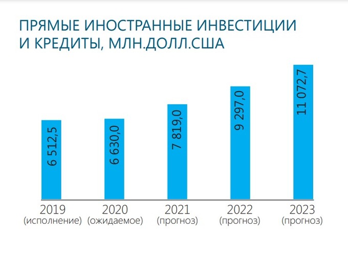 К концу года ожидается замедление темпов привлекаемых прямых иностранных инвестиций и кредитов до 1,8%. В 2021—2023 годах ожидается постепенное восстановление объема привлекаемых средств до докризисного уровня, которые по-прежнему будут направляться в сферу промышленности, сельского хозяйства, крупных инфраструктурных проектов.