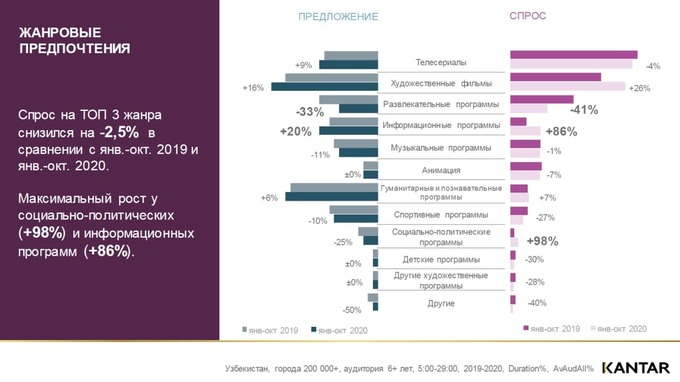 В основных жанровых предпочтениях заметно, что показатели развлекательных программ снизились как по предложению, так и по спросу. А спрос на социально-политические и информационные программы заметно превысил предложение.