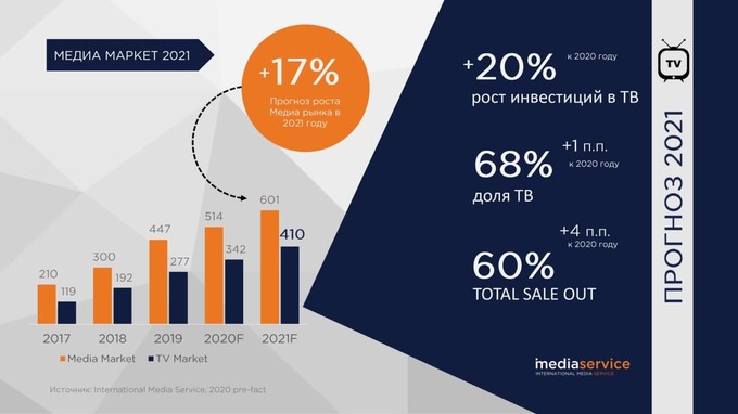 Прогнозируется, что в 2021 году медиарынок достигнет уровня в 600 млрд сумов с положительной динамикой 17%, объем телерекламного рынка увеличится на 20% и составит 410 млрд сумов. Оценка телевизионных бюджетов включает в себя спонсорство и коммерческие сюжеты: