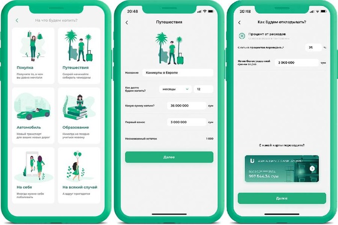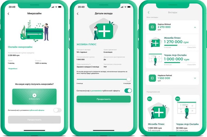 Есть два вида сумовых депозитов с выгодными, гибкими условиями. Оформить вклад можно в несколько кликов. Для тех, кому срочно понадобились деньги, доступен микрозайм на сумму до 2,2 млн сумов под 1,92% в месяц.