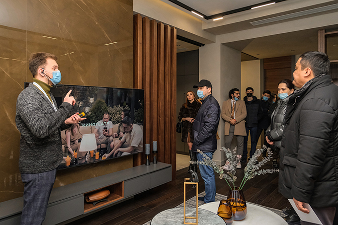 Гостям резиденции провели экскурсию по просторному лобби и трем меблированным шоурумам. Также представители рассказали о множестве бонусов при покупке апартаментов на первой линии: предчистовой отделке, возведенных перегородках по индивидуальному дизайну, центральном кондиционировании от Mitsubishi, панорамном остеклении от Schüco, системе умного дома и многом другом.