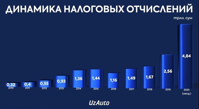 Пресс-служба «Узавтосаноат» показала динамику уплаты налогов за 2010−2020 года.