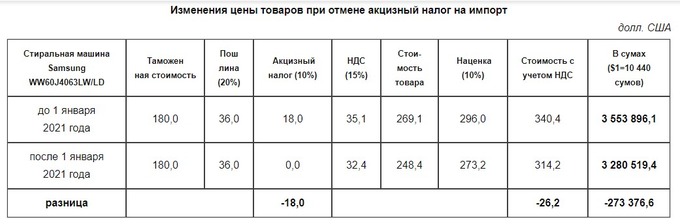 Согласно договоренностям, Узбекистан с 1 января 2021 года отменил акцизный налог по 73 товарным позициям при импорте, в том числе на электротехническую, пищевую продукцию, ковровые изделия и другие.